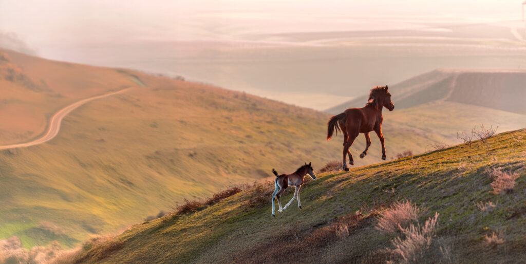 プロンプト:親馬の背中を追いかける子馬の後ろ姿で生成。なかなかいい子馬に出会えなかった。。