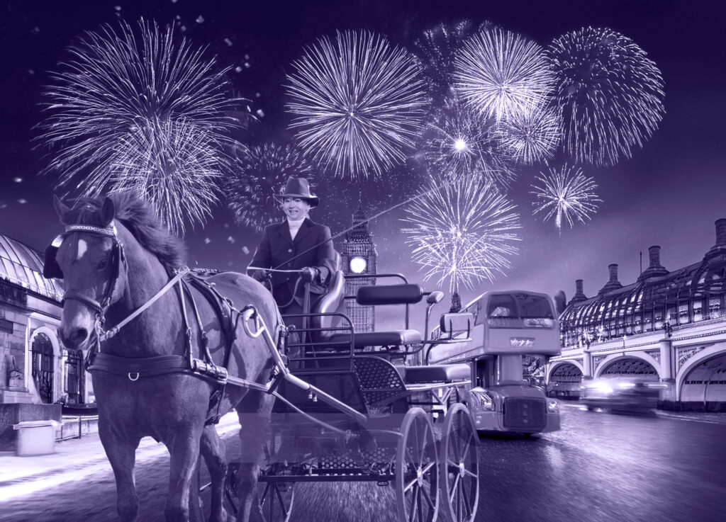 馬車の写真を生成AIで作成した背景に合成し、人物を私の顔へ変更し生成AIで馴染ませてみました。