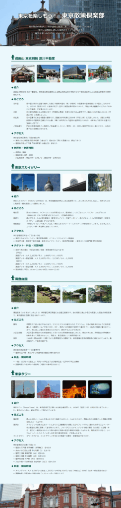<p>東京散策倶楽部は、東京都内で散策に適した場所を紹介しています。<br>東京には散策に適した場所がたくさんあります。<br>風景を楽しみながら、のんびりと歩き回ってください。</p>